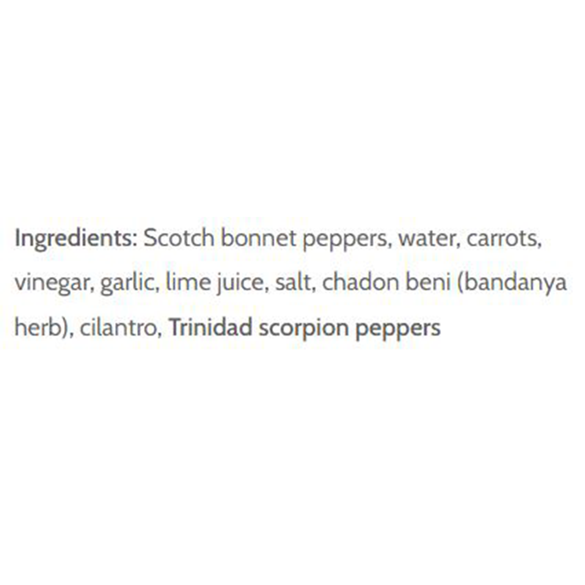 Scotch bonnet peppers, water, carrots, vinegar, garlic, lime juice, salt, chadon beni (bandanya herb), cilantro, Trinidad scorpion peppers.