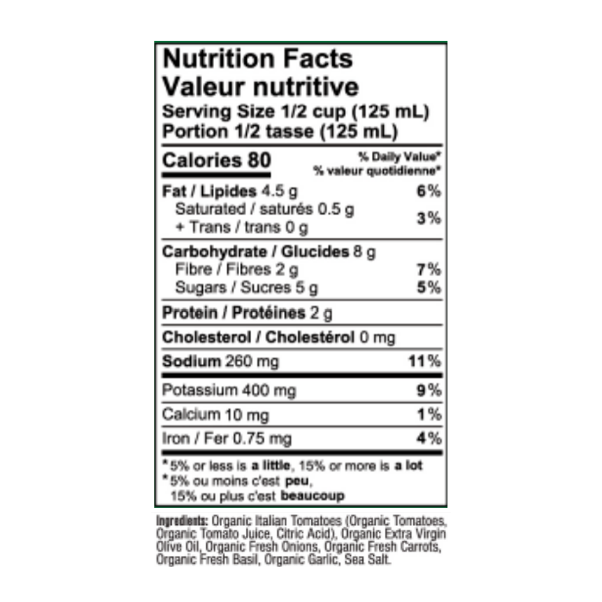 Organic Italian Tomatoes (Organic Tomatoes, Organic Tomato Juice, Citric Acid), Organic Extra Virgin Olive Oil, Organic Fresh Onions, Organic Fresh Carrots, Organic Fresh Basil, Organic Garlic, Sea Salt.