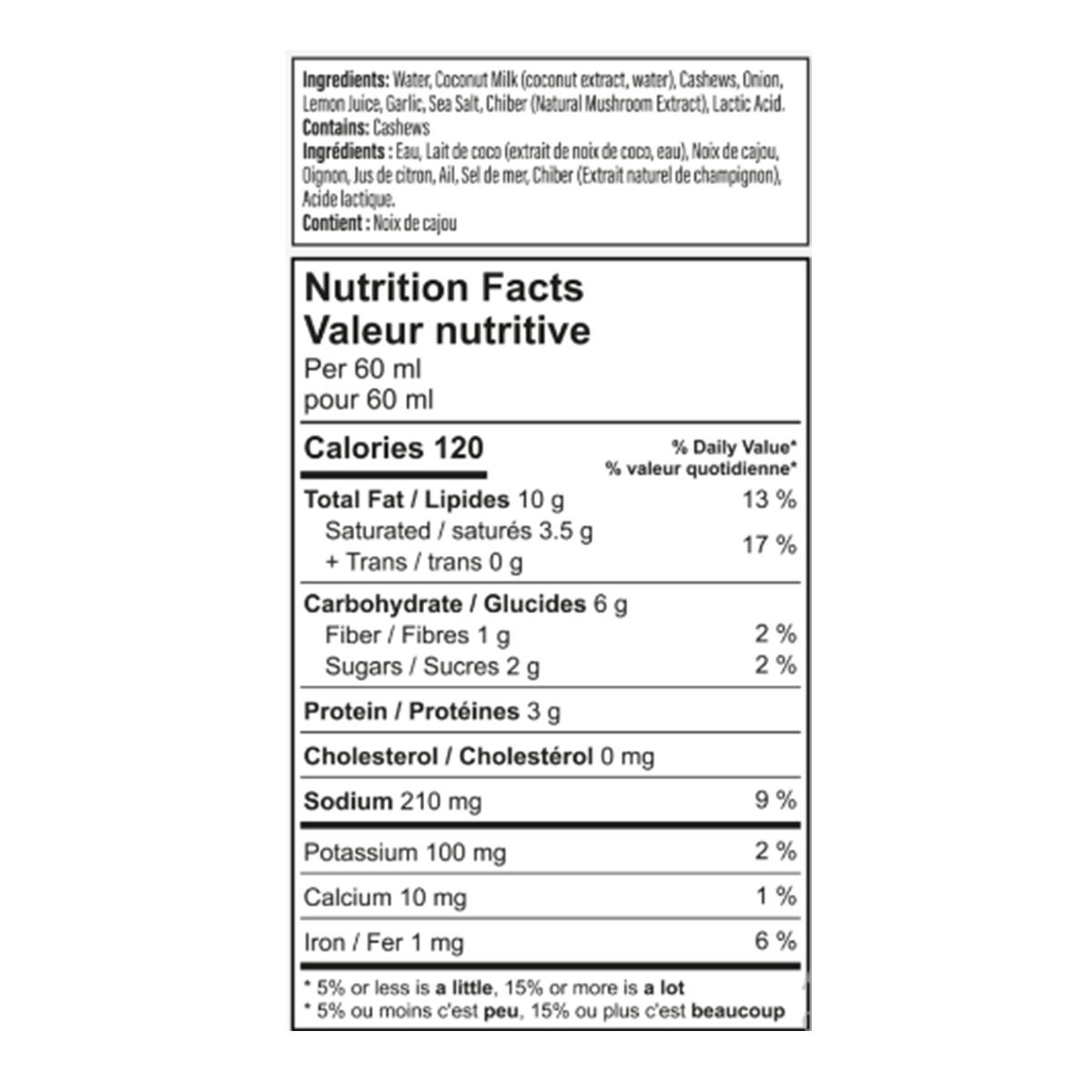 Water, Coconut Milk (coconut extract, water), Cashews, Onion, Lemon Juice, Garlic, Sea Salt, Chiber (Natural Mushroom Extract), Lactic Acid.