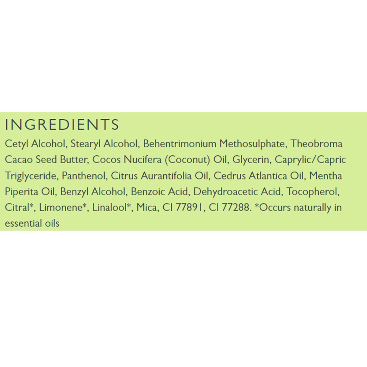 Cetyl Alcohol, Stearyl Alcohol, Behentrimonium Methosulphate, Theobroma Cacao Seed Butter, Cocos Nucifera (Coconut) Oil, Glycerin, Caprylic/Capric Triglyceride, Panthenol, Citrus Aurantifolia Oil, Cedrus Atlantica Oil, Mentha Piperita Oil, Benzyl Alcohol, Benzoic Acid, Dehydroacetic Acid, Tocopherol, Citral*, Limonene*, Linalool*, Mica, CI 77891, CI 77288. *Occurs naturally in essential oils