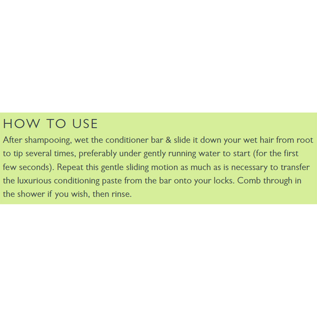 After shampooing, wet the conditioner bar & slide it down your wet hair from root to tip several times, preferably under gently running water to start (for the first few seconds). Repeat this gentle sliding motion as much as is necessary to transfer the luxurious conditioning paste from the bar onto your locks. Comb through in the shower if you wish, then rinse.