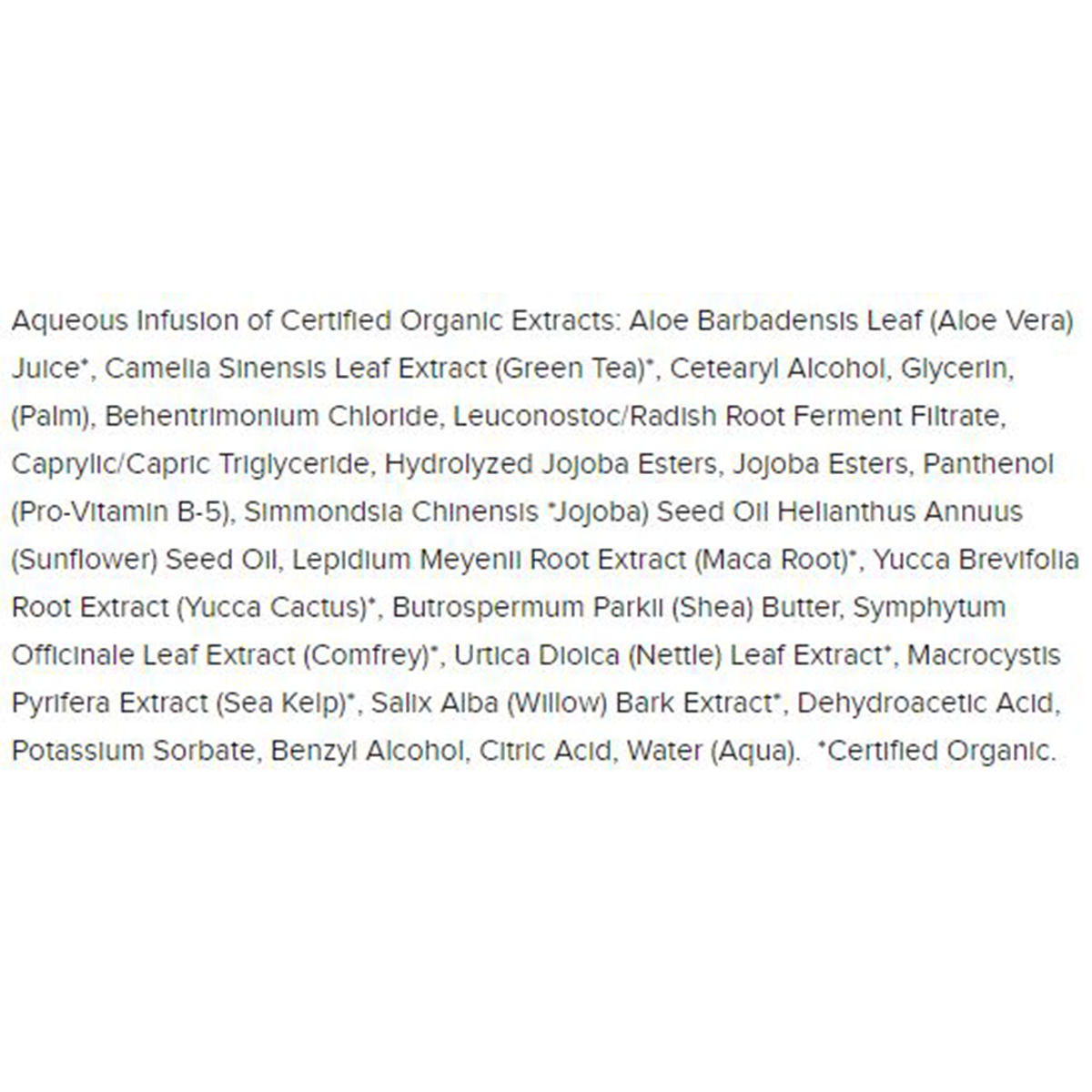 Aqueous Infusion of Certified Organic Extracts: Aloe Barbadensis Leaf (Aloe Vera) Juice*, Camelia Sinensis Leaf Extract (Green Tea)*, Cetearyl Alcohol, Glycerin,(Palm), Behentrimonium Chloride, Leuconostoc/Radish Root Ferment Filtrate, Caprylic/Capric Triglyceride, Hydrolyzed Jojoba Esters, Jojoba Esters, Panthenol (Pro-Vitamin B-5), Simmondsia Chinensis *Jojoba) Seed Oil Helianthus Annuus (Sunflower) Seed Oil, Lepidium Meyenii Root Extract (Maca Root)*, Yucca Brevifolia Root Extract (Yucca Cactus)*, Butrospermum Parkii (Shea) Butter, Symphytum Officinale Leaf Extract (Comfrey)*, Urtica Dioica (Nettle) Leaf Extract*, Macrocystis Pyrifera Extract (Sea Kelp)*, Salix Alba (Willow) Bark Extract*, Dehydroacetic Acid, Potassium Sorbate, Benzyl Alcohol, Citric Acid, Water (Aqua).