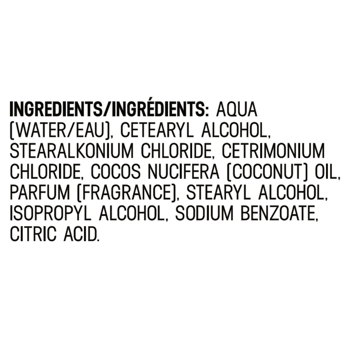 AQUA (WATER/EAU), CETEARYL ALCOHOL, STEARALKONIUM CHLORIDE, CETRIMONIUM CHLORIDE, COCOS NUCIFERA (COCONUT) OIL, PARFUM (FRAGRANCE), STEARYL ALCOHOL, ISOPROPYL ALCOHOL, SODIUM BENZOATE, CITRIC ACID.