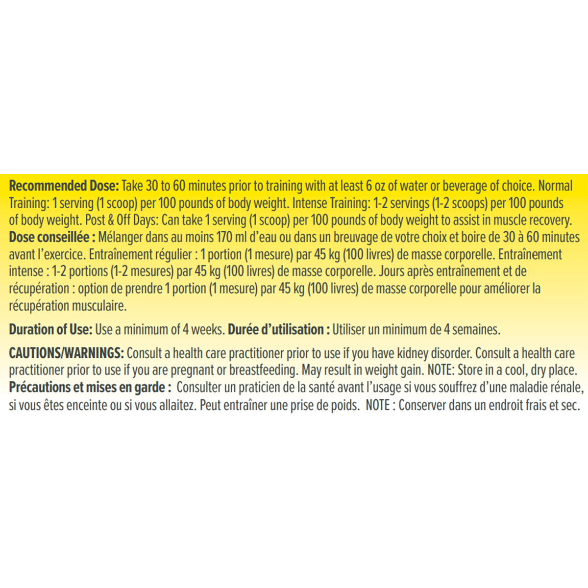 Increase Strength when used in conjunction with resistance training regimen. Improves strength in repetitive bouts of brief, highly-intense physical activity (e.g. sprints, jumping, resistance training) by increasing muscle energy levels.