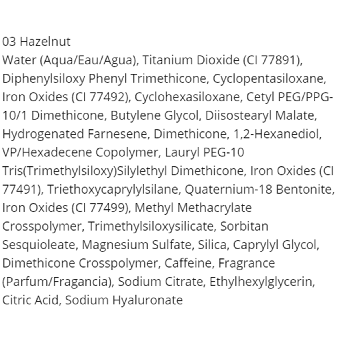 Water (Aqua/Eau/Agua), Titanium Dioxide (CI 77891), Diphenylsiloxy Phenyl Trimethicone, Cyclopentasiloxane, Iron Oxides (CI 77492), Cyclohexasiloxane, Cetyl PEG/PPG-10/1 Dimethicone, Butylene Glycol, Diisostearyl Malate, Hydrogenated Farnesene, Dimethicone, 1,2-Hexanediol, VP/Hexadecene Copolymer, Lauryl PEG-10 Tris(Trimethylsiloxy)Silylethyl Dimethicone, Iron Oxides (CI 77491), Triethoxycaprylylsilane, Quaternium-18 Bentonite, Iron Oxides (CI 77499), Methyl Methacrylate Crosspolymer, Trimethylsiloxysilicate, Sorbitan Sesquioleate, Magnesium Sulfate, Silica, Caprylyl Glycol, Dimethicone Crosspolymer, Caffeine, Fragrance (Parfum/Fragancia), Sodium Citrate, Ethylhexylglycerin, Citric Acid, Sodium Hyaluronate.