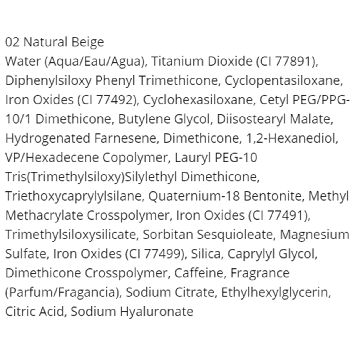 Water (Aqua/Eau/Agua), Titanium Dioxide (CI 77891), Diphenylsiloxy Phenyl Trimethicone, Cyclopentasiloxane, Iron Oxides (CI 77492), Cyclohexasiloxane, Cetyl PEG/PPG-10/1 Dimethicone, Butylene Glycol, Diisostearyl Malate, Hydrogenated Farnesene, Dimethicone, 1,2-Hexanediol, VP/Hexadecene Copolymer, Lauryl PEG-10 Tris(Trimethylsiloxy)Silylethyl Dimethicone, Triethoxycaprylylsilane, Quaternium-18 Bentonite, Methyl Methacrylate Crosspolymer, Iron Oxides (CI 77491), Trimethylsiloxysilicate, Sorbitan Sesquioleate, Magnesium Sulfate, Iron Oxides (CI 77499), Silica, Caprylyl Glycol, Dimethicone Crosspolymer, Caffeine, Fragrance (Parfum/Fragancia), Sodium Citrate, Ethylhexylglycerin, Citric Acid, Sodium Hyaluronate.