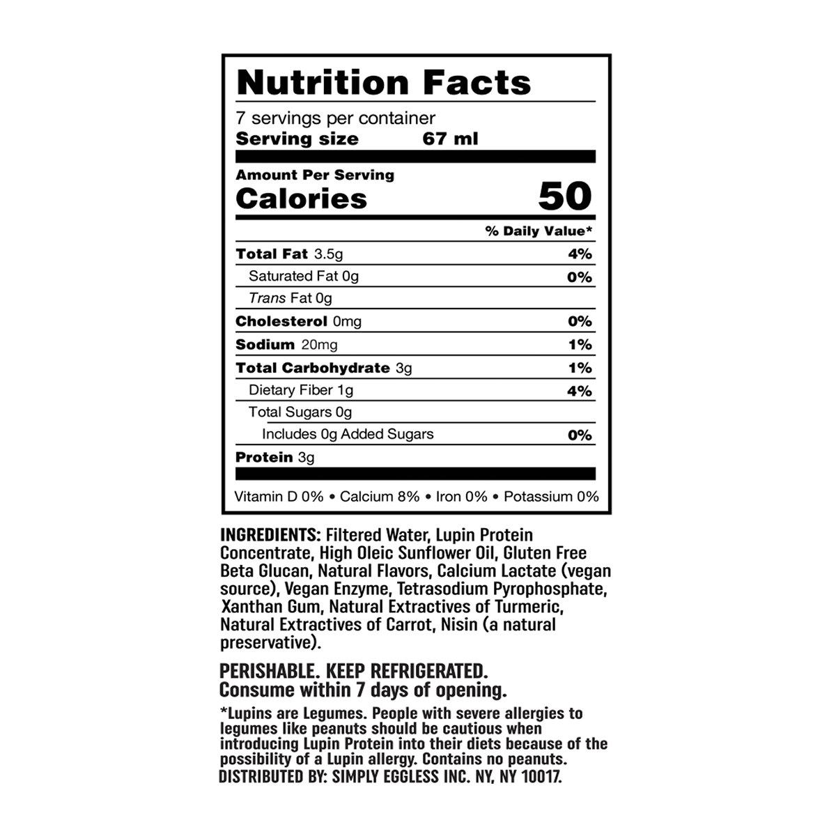 Filtered Water, Lupin Protein Concentrate, High Oleic Sunflower Oil, Gluten Free Beta Glucan, Natural Flavors, Calcium Lactate (vegan source), Vegan Enzyme, Tetrasodium Pyrophosphate, Xanthan Gum, Natural Extractives of Turmeric, Natural Extractives of Carrot, Nisin (a natural preservative).