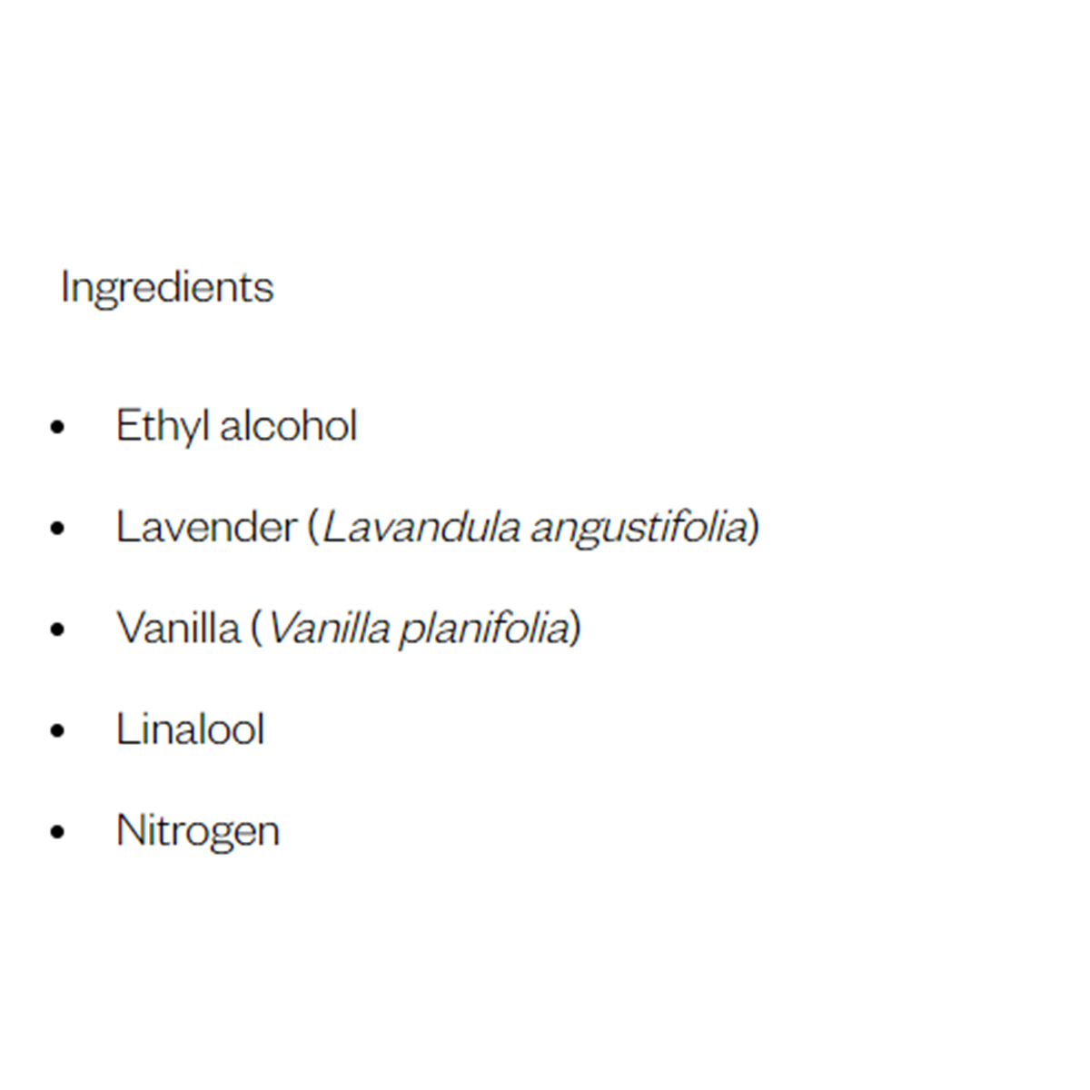 Ethyl alcohol, Lavender (Lavandula angustifolia), Vanilla (Vanilla planifolia), Linalool, Nitrogen.
