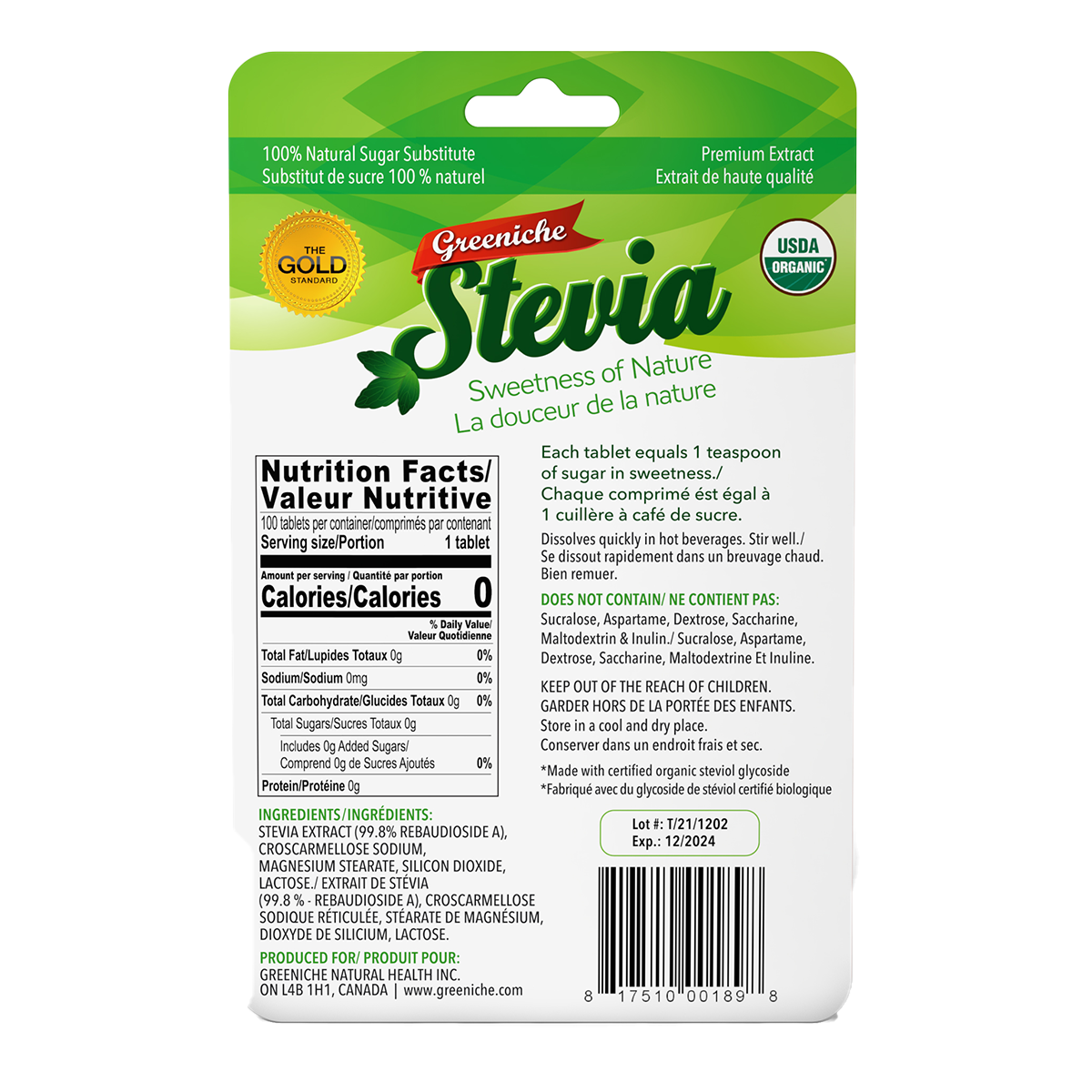The Greeniche Stevia Tablets are an all natural, calorie and carb free sweetener with a glycemic index of zero. They are the perfect sugar substitute for those living with diabetes or just looking to cut down on their sugar consumption. Stevia is extracted from the Stevia rebaudiana herb with new technology that can isolate the Reb-A sweet component and eliminate the bitter component, Reb-B. This results in a delicious and versatile sugar replacement that is sweeter per unit weight than granulated sugar, and is the only commercial sweetener that won’t intensify sugar cravings. Unlike other brands, this Stevia doesn’t contain unnecessary additives and is made with an unprecedented 99.8% Reb-A. this convenient, rapidly dissolving tablet formula makes it easy to take your sweetner with you and sweeten coffee, tea or any other beverage, hot or cold. Keep your life sweet without the guilt or health concerns and soon you’ll have forgotten it’s not sugar!