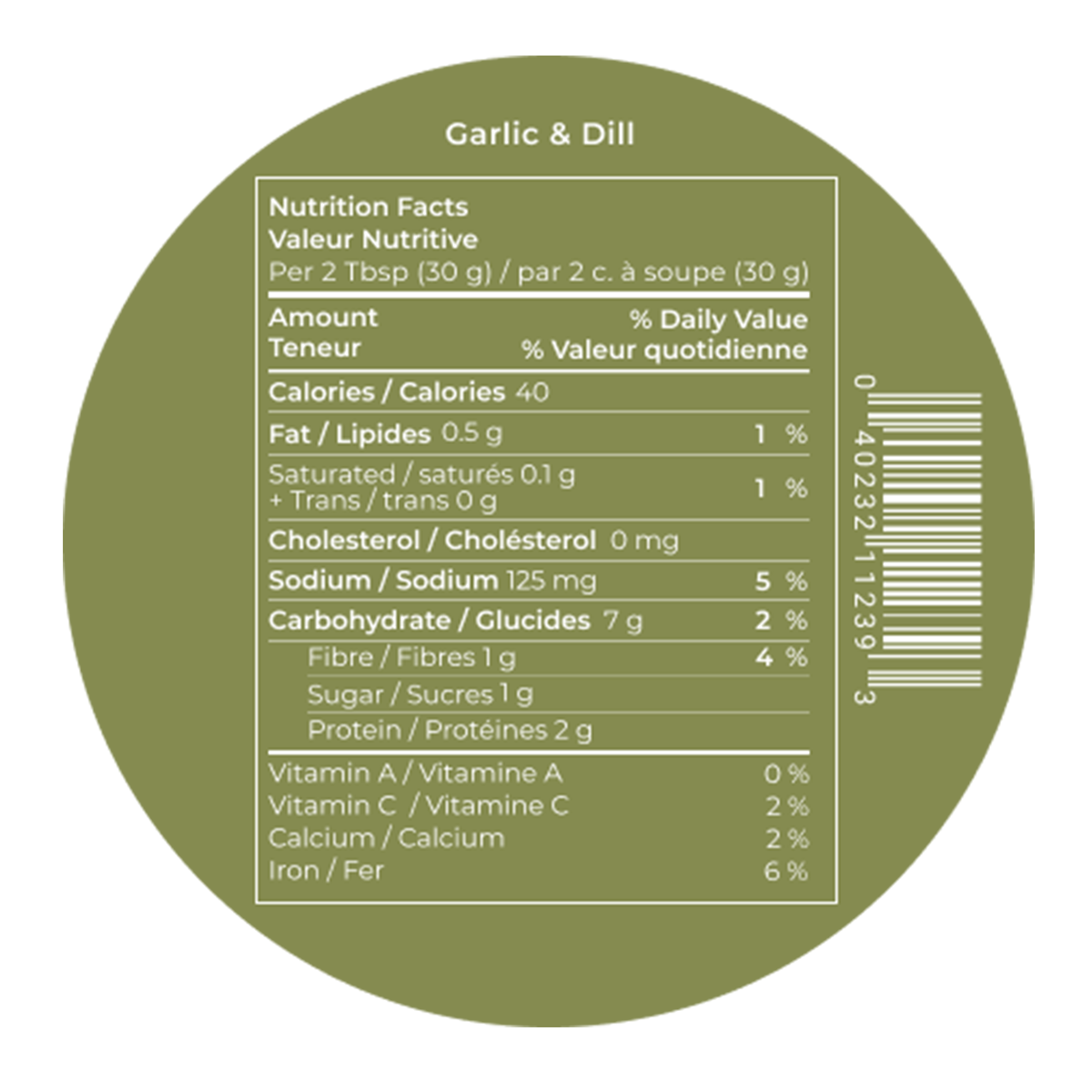 The Roasted Garlic & Dill recipe was born out of a passion for experimenting with the finest Saskatchewan-grown ingredients to create a uniquely prairie-made hummus that would blow you away. With the fragrant aroma of roasting garlic and the bold scent of dill, a little of this and a little of that led to the creation of Roasted Garlic & Dill Hummus.