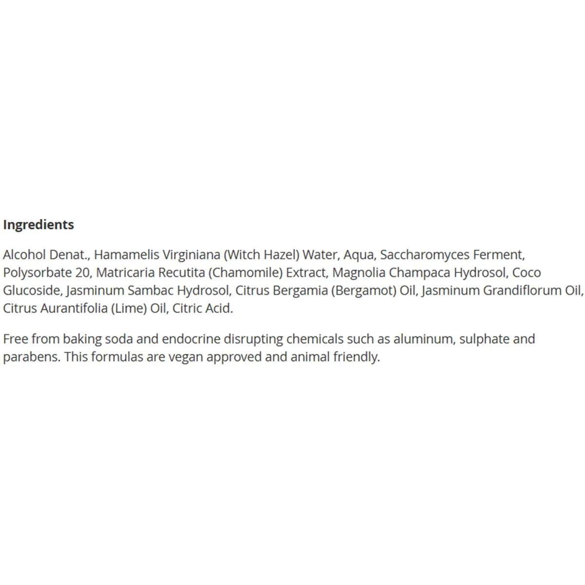 Alcohol Denat., Hamamelis Virginiana (Witch Hazel) Water, Aqua, Saccharomyces Ferment, Polysorbate 20, Matricaria Recutita (Chamomile) Extract, Magnolia Champaca Hydrosol, Coco Glucoside, Jasminum Sambac Hydrosol, Citrus Bergamia (Bergamot) Oil, Jasminum Grandiflorum Oil, Citrus Aurantifolia (Lime) Oil, Citric Acid.