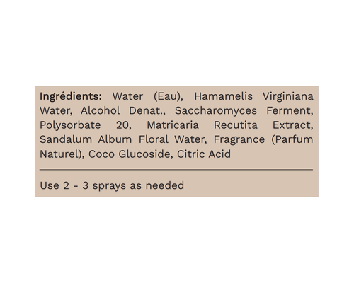 Water (Eau), Hamamelis Virginiana Water, Alcohol Denat., Saccharomyces Ferment, Polysorbate 20, Matricaria Recutita Extract, Sandalum Album Floral Water, Fragrance (Parfum Naturel), Coco Glucoside, Citric Acid