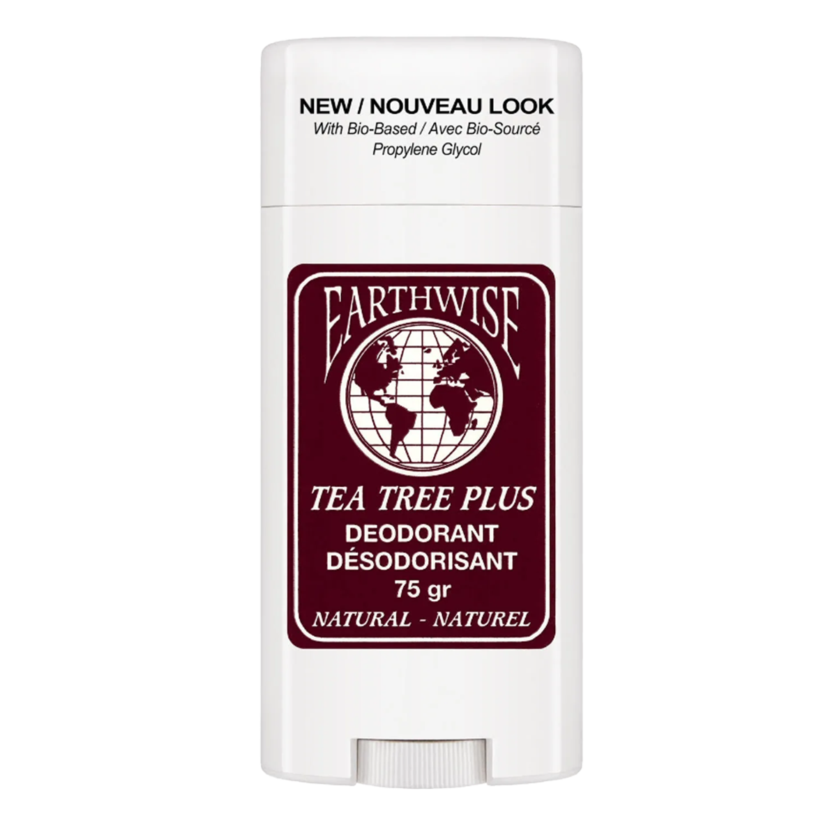 Earthwise Tea Tree Plus Natural Deodorant is made from bio-based (vegetable) propylene glycol and free of aluminum, parabens, triclosan, fragrance and colourants.