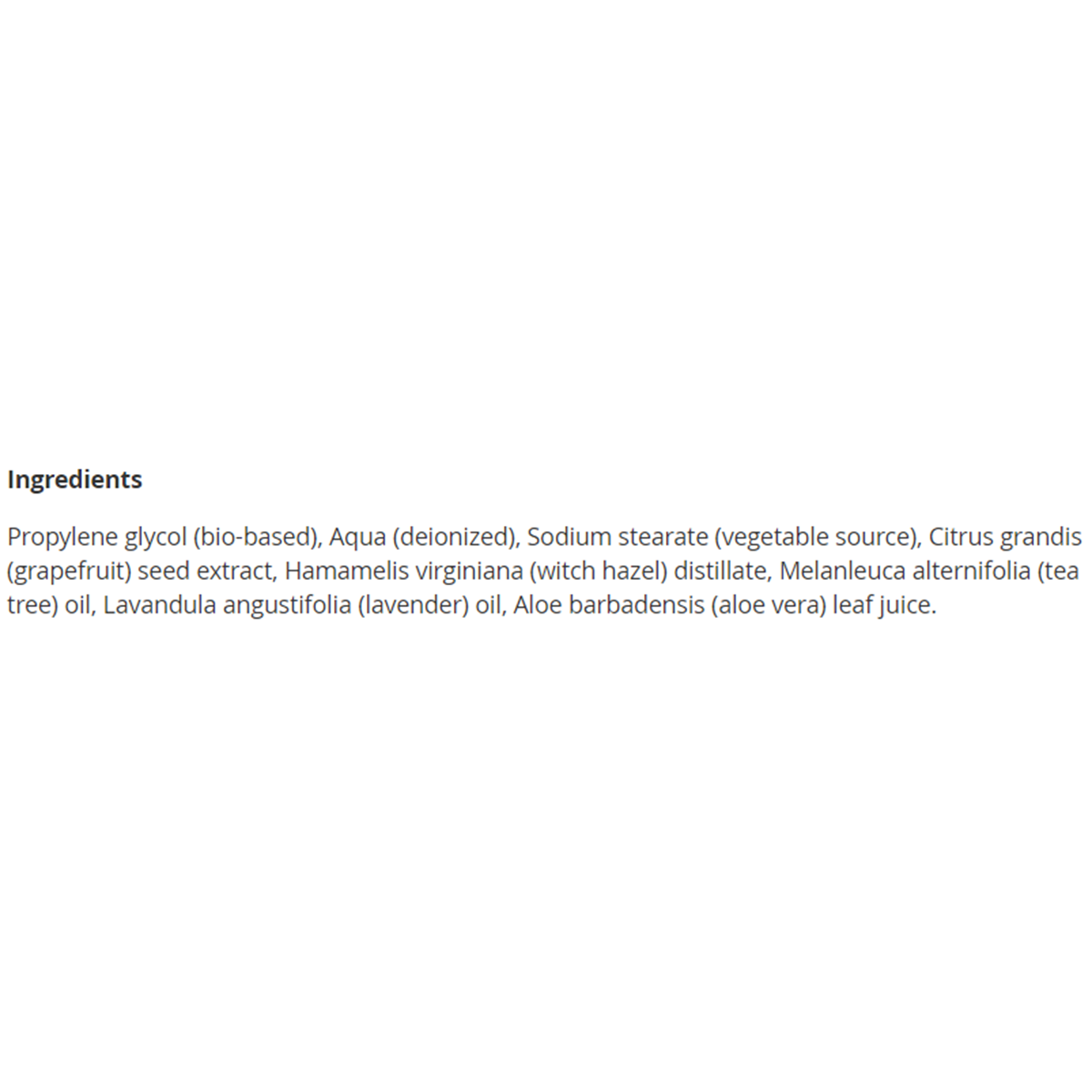 Propylene glycol (bio-based), Aqua (deionized), Sodium stearate (vegetable source), Citrus grandis (grapefruit) seed extract, Hamamelis virginiana (witch hazel) distillate, Melanleuca alternifolia (tea tree) oil, Lavandula angustifolia (lavender) oil, Aloe barbadensis (aloe vera) leaf juice.