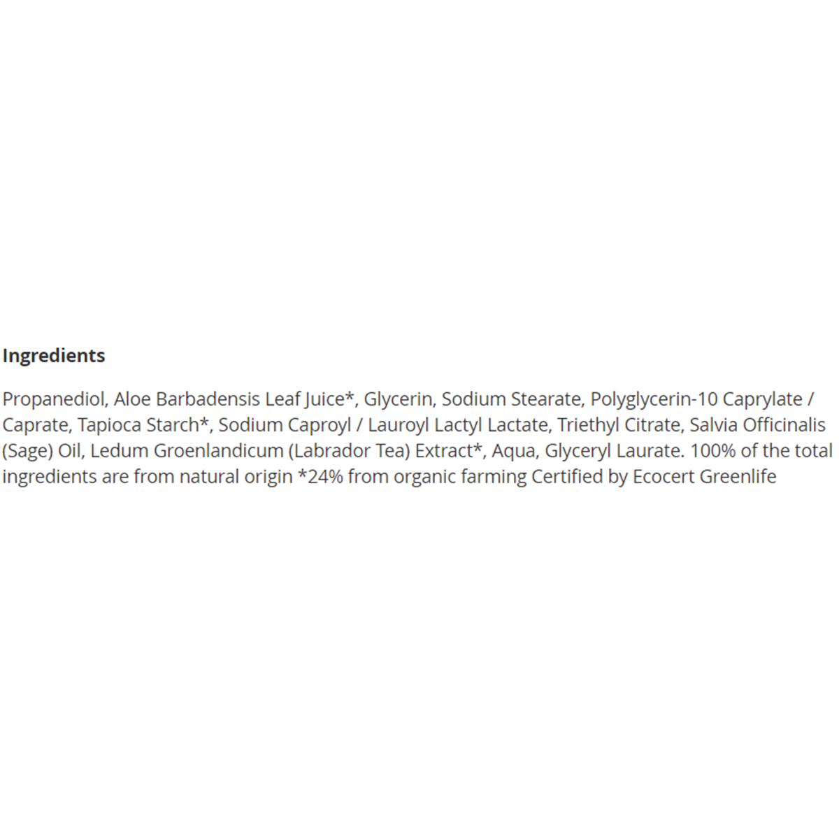 Propanediol, Aloe Barbadensis Leaf Juice*, Glycerin, Sodium Stearate, Polyglycerin-10 Caprylate / Caprate, Tapioca Starch*, Sodium Caproyl / Lauroyl Lactyl Lactate, Triethyl Citrate, Salvia Officinalis (Sage) Oil, Ledum Groenlandicum (Labrador Tea) Extract*, Aqua, Glyceryl Laurate. 100% of the total ingredients are from natural origin *24% from organic farming Certified by Ecocert Greenlife
