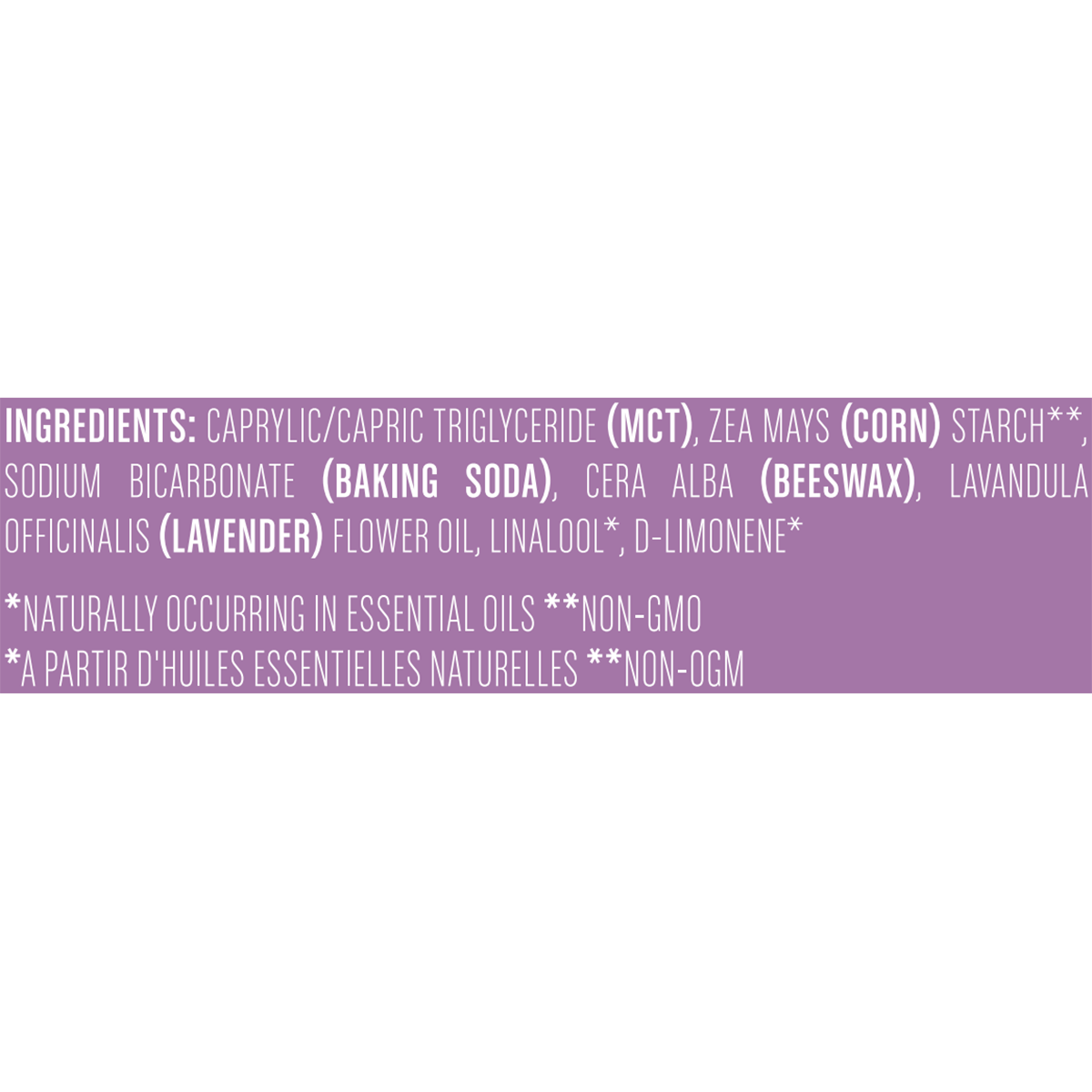 Caprylic/Capric Triglyceride (Mct), Zea Mays (Corn) Starch Sodium Bicarbonate (Baking Soda), Cera Alba (Beeswax), Lavandula Officinalis (Lavender) Flower Oil, Linalool, D-Limonene.