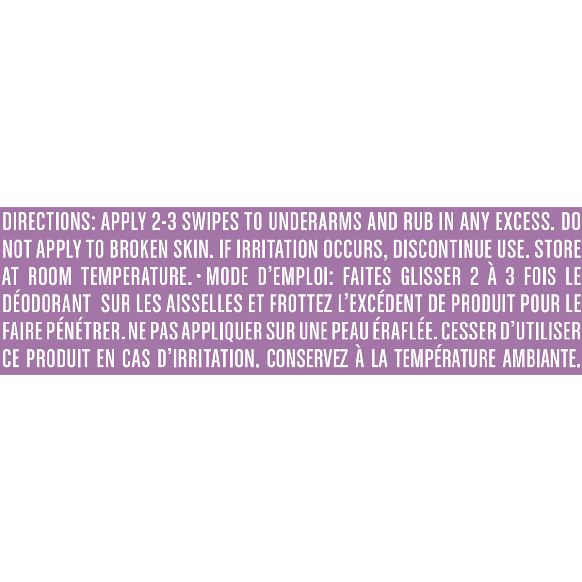 Apply 2-3 Swipes To Underarms And Rub In Any Excess. Do Not Apply To Broken Skin. If Irritation Occurs, Discontinue Use. Store At Room Temperature