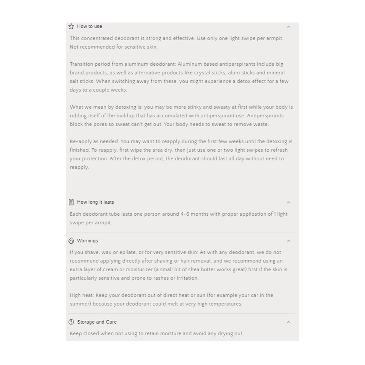 If you shave, wax or epilate, or for very sensitive skin: As with any deodorant, we do not recommend applying directly after shaving or hair removal, and we recommend using an extra layer of cream or moisturizer (a small bit of shea butter works great) first if the skin is particularly sensitive and prone to rashes or irritation.