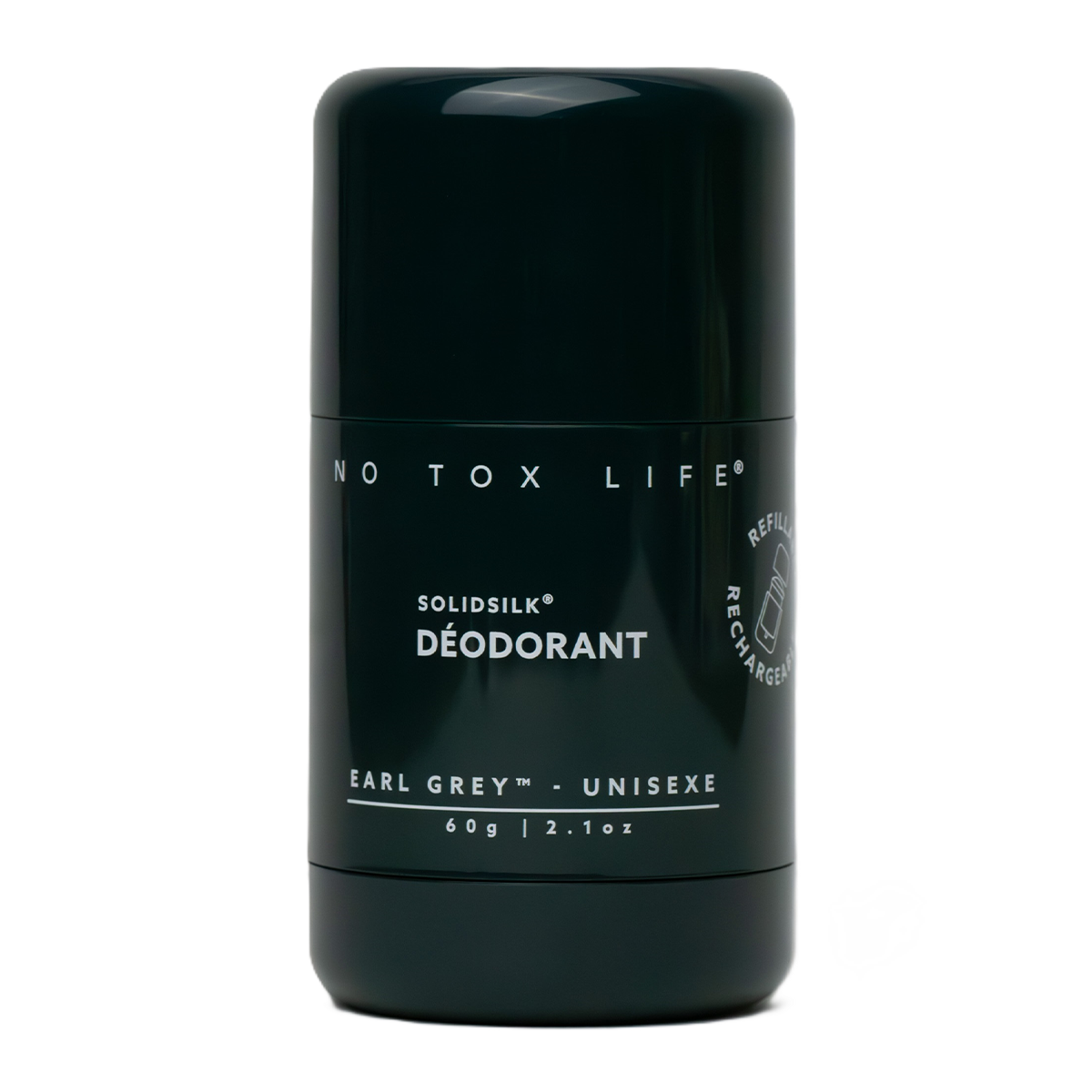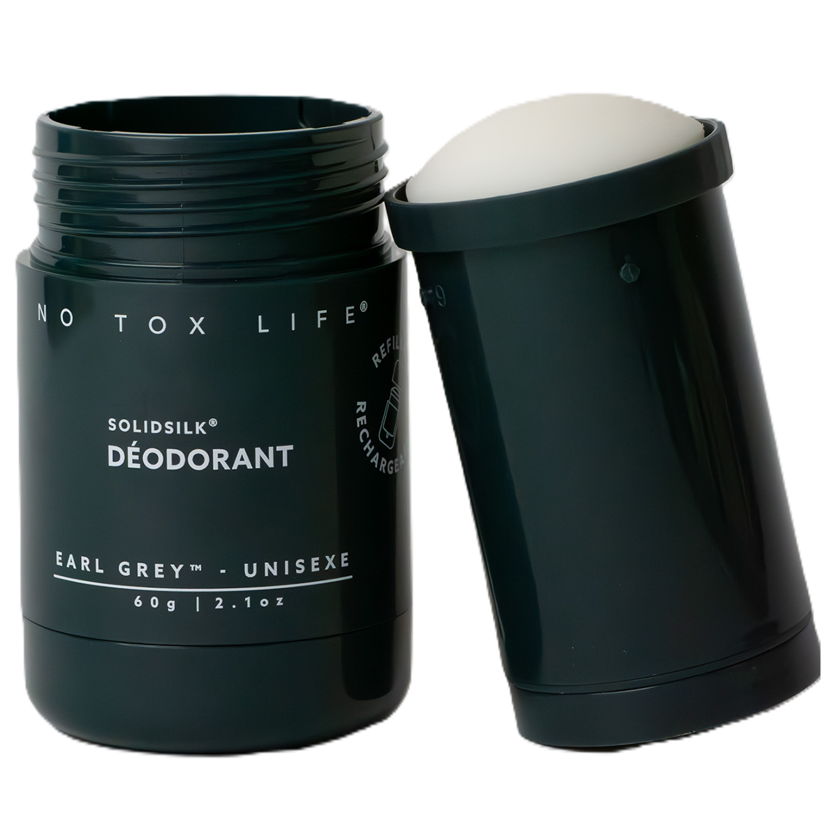No Tox Life SOLIDSILK Refillable Deodorant in Earl Grey, with a clean citrus and woods fragrance. Unisex.