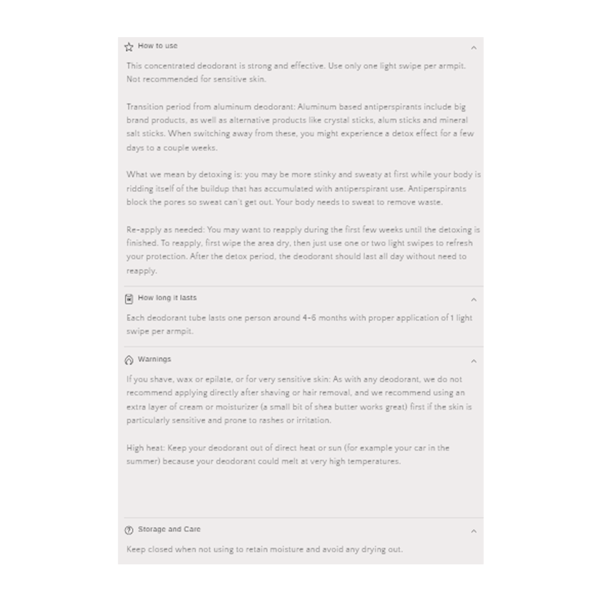 If you shave, wax or epilate, or for very sensitive skin: As with any deodorant, we do not recommend applying directly after shaving or hair removal, and we recommend using an extra layer of cream or moisturizer (a small bit of shea butter works great) first if the skin is particularly sensitive and prone to rashes or irritation.