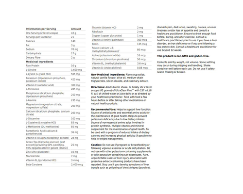 Adults blend, shake, or briskly stir 2 level scoops (42 grams) of UltraClear Plus with 237 mL (8 fl. oz.) of chilled water or juice daily or as directed by your healthcare practitioner. Take with food a few hours before or after taking other Health Products or natural health products.