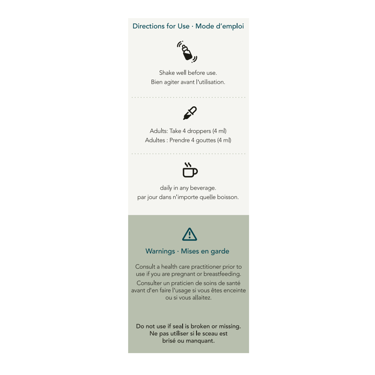 Adults: Take 4 droppers (4 ml) daily in any beverage.