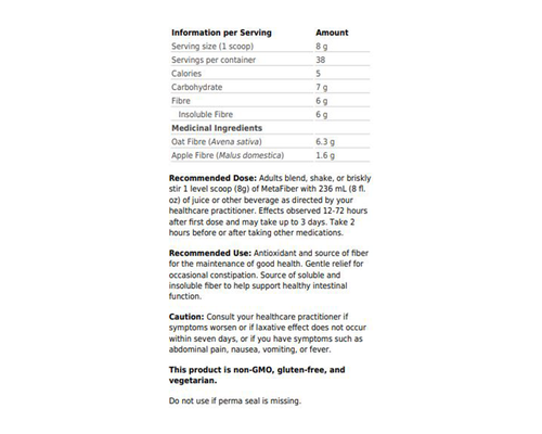 Adults blend, shake, or briskly stir 1 level scoop (8g) of MetaFiber with 236 mL (8 fl. oz) of juice or other beverage as directed by your healthcare practitioner. Effects observed 12-rapid after first dose and may take up to 3 days. Take 2 hours before or after taking other Health Products.
