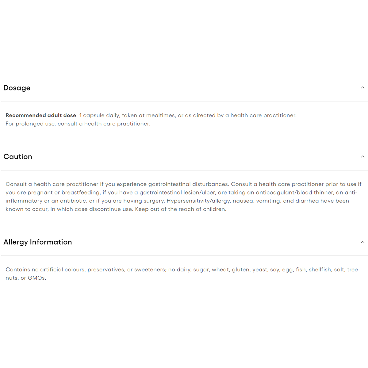 Consult a health Wellness-Care practitioner if you experience gastrointestinal disturbances. Consult a health Wellness-Care practitioner prior to use if you are pregnant or breastfeeding, if you have a gastrointestinal lesion/ulcer, are taking an anticoagulant/blood thinner, an anti-inflammatory or an antibiotic, or if you are having surgery. Hypersensitivity/allergy, nausea, vomiting, and diarrhea have been known to occur, in which case discontinue use. Keep out of the reach of children.