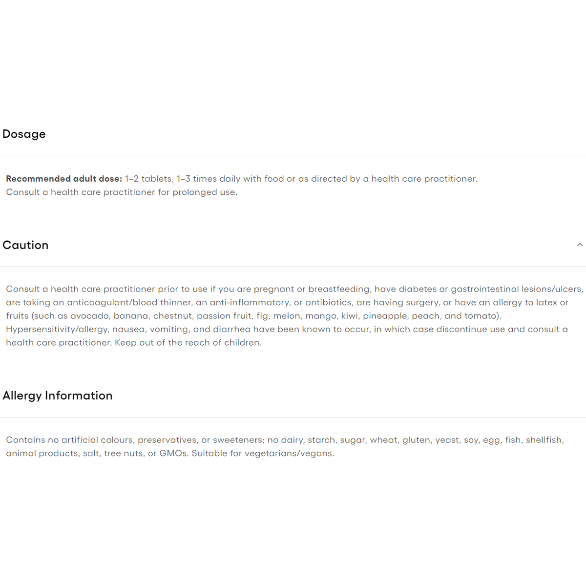 Consult a health Wellness-Care practitioner prior to use if you are pregnant or breastfeeding, have diabetes or gastrointestinal lesions/ulcers, are taking an anticoagulant/blood thinner, an anti-inflammatory, or antibiotics, are having surgery, or have an allergy to latex or fruits (such as avocado, banana, chestnut, passion fruit, fig, melon, mango, kiwi, pineapple, peach, and tomato). Hypersensitivity/allergy, nausea, vomiting, and diarrhea have been known to occur, in which case discontinue use and consult a health Wellness-Care practitioner. Keep out of the reach of children.