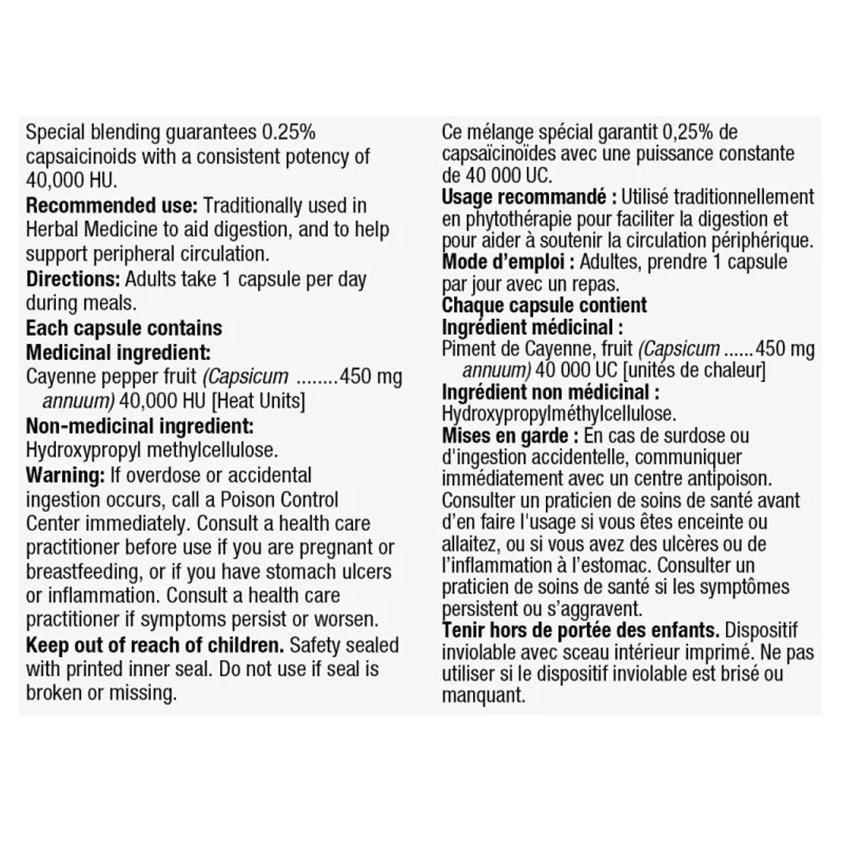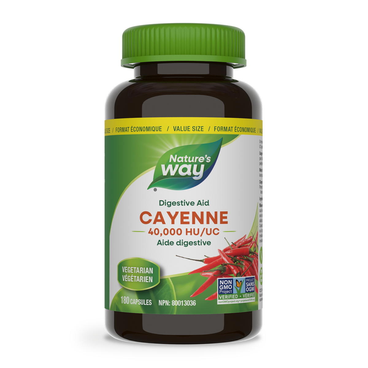 Nature's Way Cayenne 40,000 HU is made using a special blending process that guarantees 0.25% capsaicinoids with a consistent potency of 40,000 HU. Cayenne is traditionally used in herbal medicine to aid digestion and to Assist Aid peripheral circulation. Nature's Way Cayenne 40,000 HU is Vegetarian and Non-GMO Project Verified.