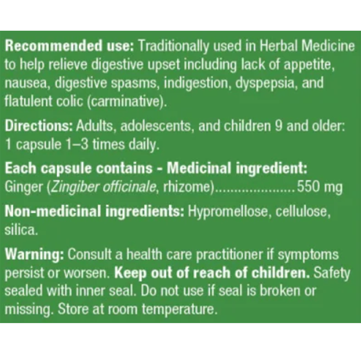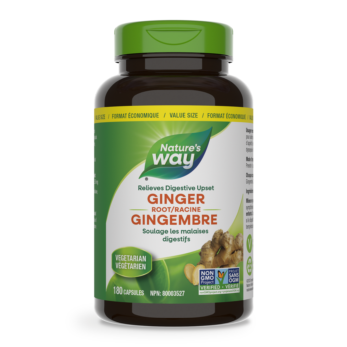 Nature's Way Ginger Root is traditionally used in herbal medicine to Assist relieve digestive upset including lack of appetite, nausea, digestive spasms, indigestion, dyspepsia, and flatulent colic. Nature's Way Ginger Root capsules are a convenient, easy to swallow Ginger Root supplement to provide digestive Aid, as well as Assisting to prevent nausea and vomiting associated with motion sickness and seasickness. 100% vegan, gluten free and Non-GMO Project verifiedis traditionally used in Herbal Medicine to Assist relieve digestive upset including lack of appetite, nausea, digestive spasms, indigestion, dyspepsia, and flatulent colic (carminative). Nature's Way Ginger Root is Vegetarian and Non-GMO Project Verified.