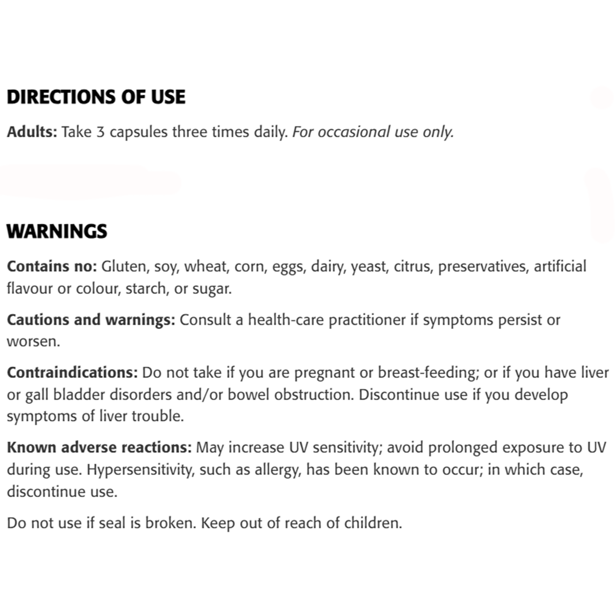 Do not take if you are pregnant or breast-feeding; or if you have liver or gall bladder disorders and/or bowel obstruction. Discontinue use if you develop symptoms of liver trouble.