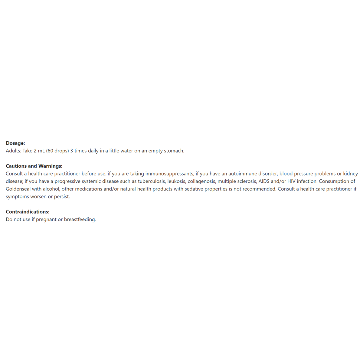 Consult a health Wellness-Care practitioner before use: if you are taking immunosuppressants; if you have an autoimmune disorder, blood pressure problems or kidney disease; if you have a progressive systemic disease such as tuberculosis, leukosis, collagenosis, multiple sclerosis, AIDS and/or HIV infection. Consumption of Goldenseal with alcohol, other Health Products and/or natural health products with sedative properties is not recommended. Consult a health Wellness-Care practitioner if symptoms worsen or persist.