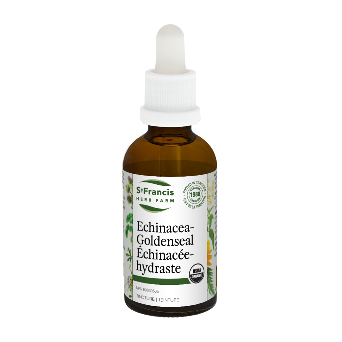 Certified Organic Echinacea (Echinacea angustifolia, root and rhizome), Certified Organic Goldenseal (Hydrastis Canadensis, root and rhizome).