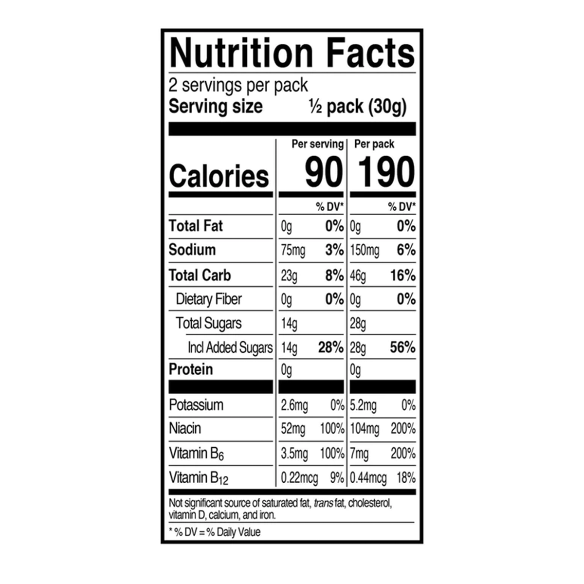 Tapioca Syrup†, Cane Sugar†, Water, Tapioca Syrup Solids †, Pectin, Contains 1 % Or Less Of: Citric Acid, Sodium Citrate, Ascorbic Acid, Natural Flavor†, Vitamin B3, Sunflower Oil†, Fruit Blend† (Apple†, Acai†, Blueberry†, Pomegranate Fruit Extract†), Annatto† (For Color), Sea Salt, Carnauba Wax†, Vitamin B6, Vitamin B12. (†Organic)