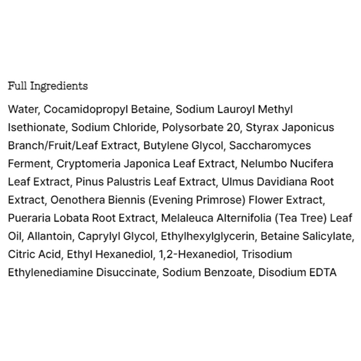 Water, Cocamidopropyl Betaine, Sodium Lauroyl Methyl Isethionate, Sodium Chloride, Polysorbate 20, Styrax Japonicus Branch/Fruit/Leaf Extract, Butylene Glycol, Saccharomyces Ferment, Cryptomeria Japonica Leaf Extract, Nelumbo Nucifera Leaf Extract, Pinus Palustris Leaf Extract, Ulmus Davidiana Root Extract, Oenothera Biennis (Evening Primrose) Flower Extract, Pueraria Lobata Root Extract, Melaleuca Alternifolia (Tea Tree) Leaf Oil, Allantoin, Caprylyl Glycol, Ethylhexylglycerin, Betaine Salicylate, Citric Acid, Ethyl Hexanediol, 1,2-Hexanediol, Trisodium Ethylenediamine Disuccinate, Sodium Benzoate, Disodium EDTA.