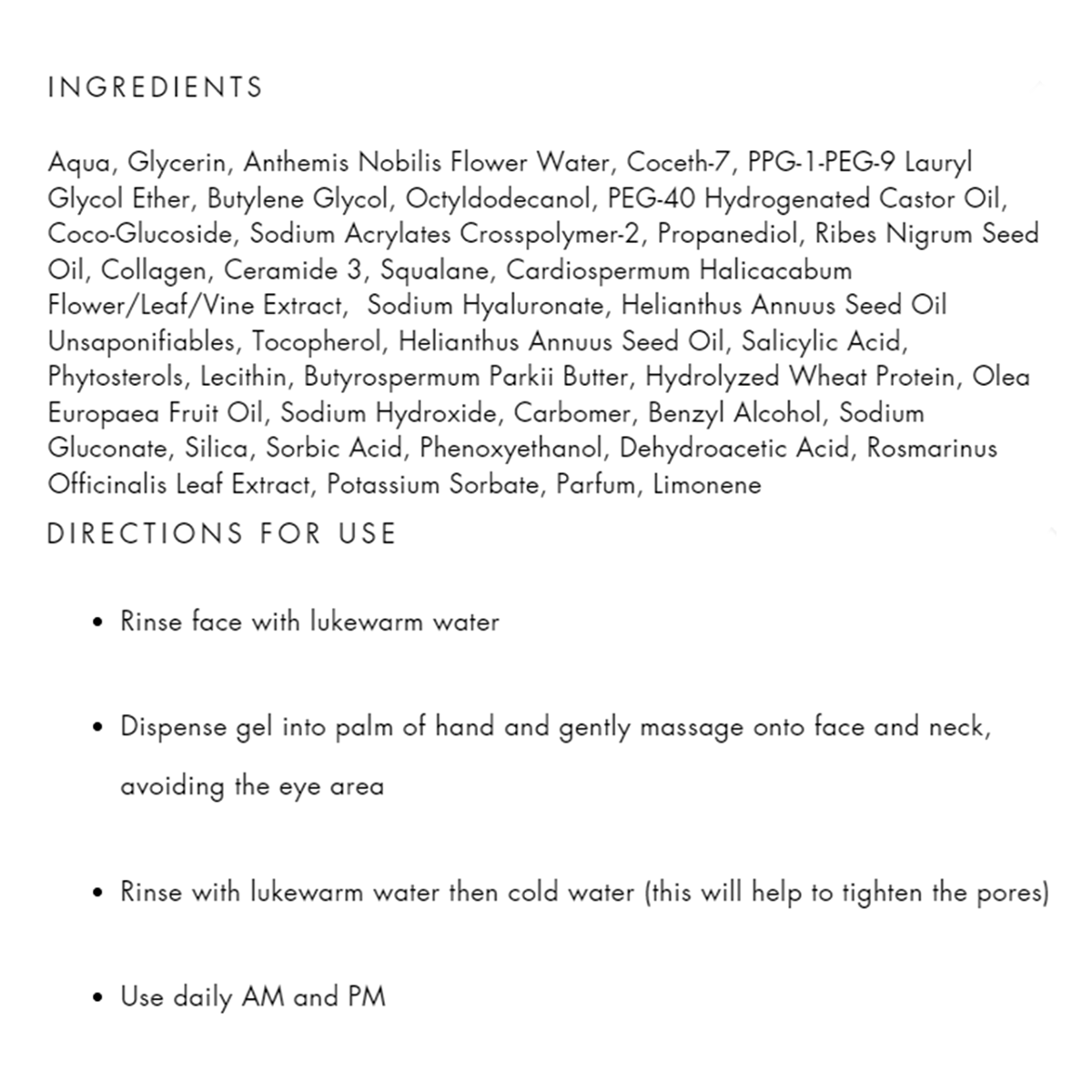 Aqua, Glycerin, Anthemis Nobilis Flower Water, Coceth-7, PPG-1-PEG-9 Lauryl Glycol Ether, Butylene Glycol, Octyldodecanol, PEG-40 Hydrogenated Castor Oil, Coco-Glucoside, Sodium Acrylates Crosspolymer-2, Propanediol, Ribes Nigrum Seed Oil, Collagen, Ceramide 3, Squalane, Cardiospermum Halicacabum Flower/Leaf/Vine Extract, Sodium Hyaluronate, Helianthus Annuus Seed Oil Unsaponifiables, Tocopherol, Helianthus Annuus Seed Oil, Salicylic Acid, Phytosterols, Lecithin, Butyrospermum Parkii Butter, Hydrolyzed Wheat Protein, Olea Europaea Fruit Oil, Sodium Hydroxide, Carbomer, Benzyl Alcohol, Sodium Gluconate, Silica, Sorbic Acid, Phenoxyethanol, Dehydroacetic Acid, Rosmarinus Officinalis Leaf Extract, Potassium Sorbate, Parfum, Limonene.