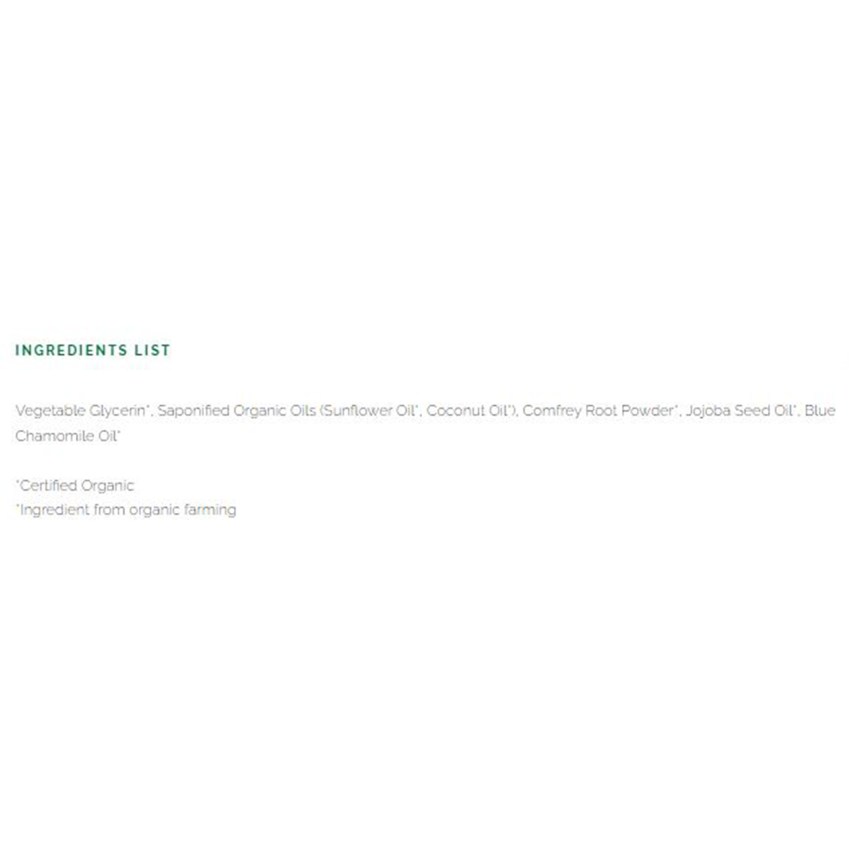Vegetable Glycerin*, Saponified Organic Oils (Sunflower Oil*, Coconut Oil*), Comfrey Root Powder*, Jojoba Seed Oil*, Blue Chamomile Oil*