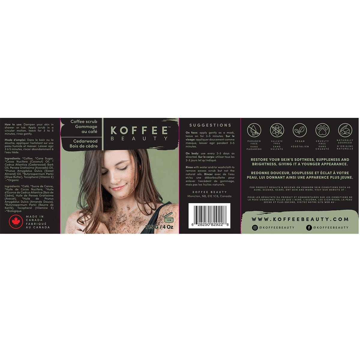 Warming and cleansing, with a strong woody sweet scent, cedarwood oil has anti-inflammatory and antimicrobial properties that will soothe dry skin and replenish the skin’s moisture barrier. After a light scrub, non-abrasive coffee particles will exfoliate gently revealing radiant-looking skin.