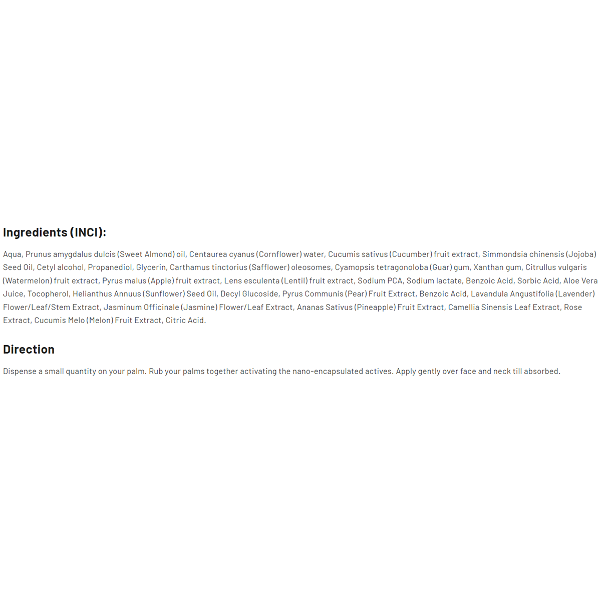 Dispense a small quantity on your palm. Rub your palms together activating the nano-encapsulated actives. Apply gently over face and neck till absorbed.