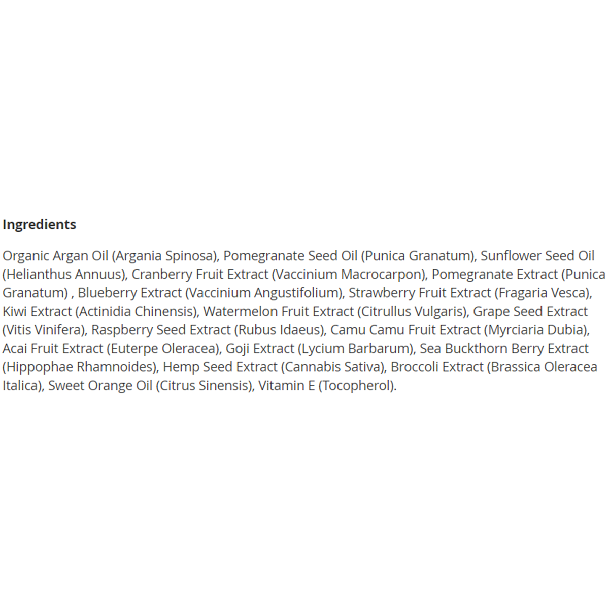 Organic Argan Oil (Argania Spinosa), Pomegranate Seed Oil (Punica Granatum), Sunflower Seed Oil (Helianthus Annuus), Cranberry Fruit Extract (Vaccinium Macrocarpon), Pomegranate Extract (Punica Granatum) , Blueberry Extract (Vaccinium Angustifolium), Strawberry Fruit Extract (Fragaria Vesca), Kiwi Extract (Actinidia Chinensis), Watermelon Fruit Extract (Citrullus Vulgaris), Grape Seed Extract (Vitis Vinifera), Raspberry Seed Extract (Rubus Idaeus), Camu Camu Fruit Extract (Myrciaria Dubia), Acai Fruit Extract (Euterpe Oleracea), Goji Extract (Lycium Barbarum), Sea Buckthorn Berry Extract (Hippophae Rhamnoides), Hemp Seed Extract (Cannabis Sativa), Broccoli Extract (Brassica Oleracea Italica), Sweet Orange Oil (Citrus Sinensis), Vitamin E (Tocopherol).