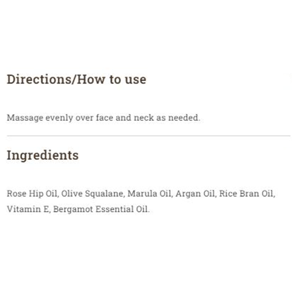 Rose Hip Oil, Olive Squalane, Marula Oil, Argan Oil, Rice Bran Oil, Vitamin E, Bergamot Essential Oil.