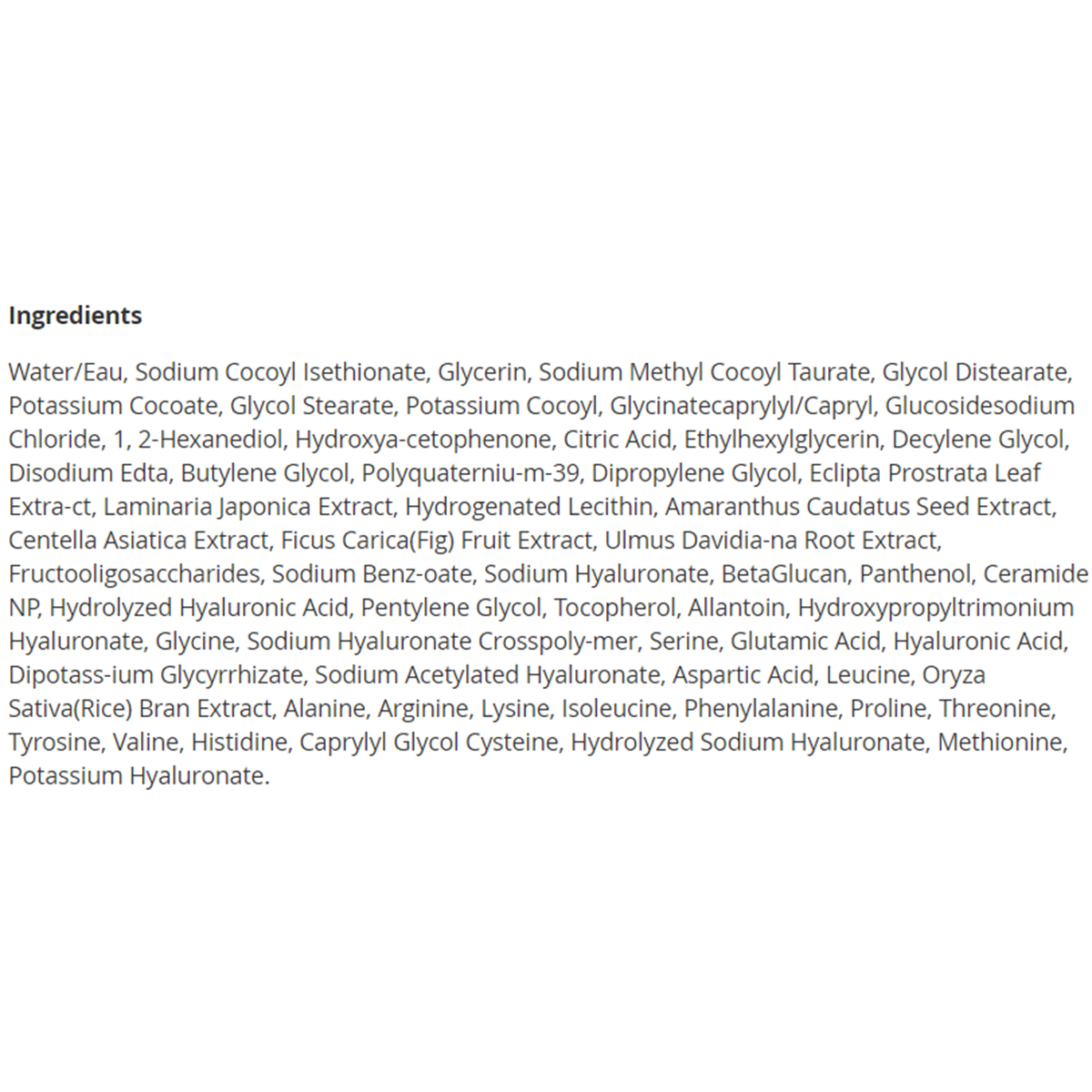 Water/Eau, Sodium Cocoyl Isethionate, Glycerin, Sodium Methyl Cocoyl Taurate, Glycol Distearate, Potassium Cocoate, Glycol Stearate, Potassium Cocoyl, Glycinatecaprylyl/Capryl, Glucosidesodium Chloride, 1, 2-Hexanediol, Hydroxya-cetophenone, Citric Acid, Ethylhexylglycerin, Decylene Glycol, Disodium Edta, Butylene Glycol, Polyquaterniu-m-39, Dipropylene Glycol, Eclipta Prostrata Leaf Extra-ct, Laminaria Japonica Extract, Hydrogenated Lecithin, Amaranthus Caudatus Seed Extract, Centella Asiatica Extract, Ficus Carica(Fig) Fruit Extract, Ulmus Davidia-na Root Extract, Fructooligosaccharides, Sodium Benz-oate, Sodium Hyaluronate, BetaGlucan, Panthenol, Ceramide NP, Hydrolyzed Hyaluronic Acid, Pentylene Glycol, Tocopherol, Allantoin, Hydroxypropyltrimonium Hyaluronate, Glycine, Sodium Hyaluronate Crosspoly-mer, Serine, Glutamic Acid, Hyaluronic Acid, Dipotass-ium Glycyrrhizate, Sodium Acetylated Hyaluronate, Aspartic Acid, Leucine, Oryza Sativa(Rice) Bran Extract, Alanine, Arginine, Lysine, Isoleucine, Phenylalanine, Proline, Threonine, Tyrosine, Valine, Histidine, Caprylyl Glycol Cysteine, Hydrolyzed Sodium Hyaluronate, Methionine, Potassium Hyaluronate.