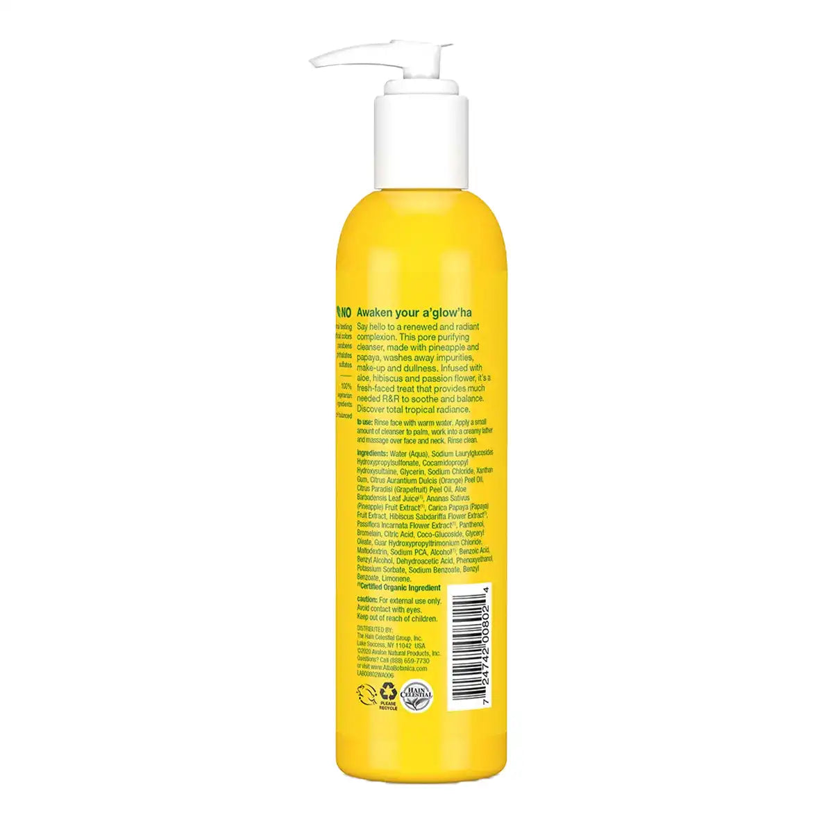 Aqua (Water), Decyl Glucoside, Cocamidopropyl Hydroxysultaine, Glycerin, Aloe Barbadensis Leaf Juice (1), Ananas Sativus (Pineapple) Fruit Extract (1), Carica Papaya (Papaya) Fruit Extract, Hibiscus Sabdariffa Flower Extract (1), Passiflora Incarnata Flower Extract (1), Guar Hydroxypropyltrimonium, Chloride, Bromelain, Maltodextrin, Panthenol, Sodium PCA, Coco-Glucoside, Glyceryl Oleate, Xanthan Gum, Citric Acid, Alcohol (1), Benzyl Alcohol, Sodium Benzoate, Potassium Sorbate, Benzyl Benzoate, Limonene, Fragrance (Parfum). (1) Certified Organic Ingredient.