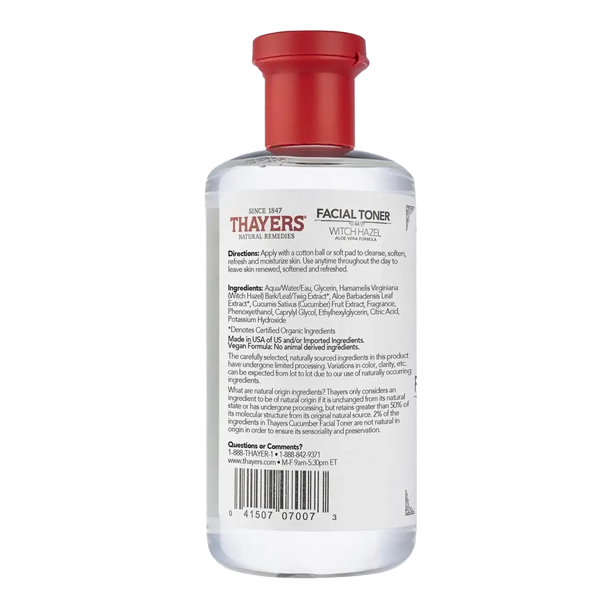 Stay as cool as a cucumber. THAYERS Cucumber Facial Toner visibly improves the quality of skin, revealing glowy, moisturized skin that looks and feels healthier. This alcohol-free, gentle, non-drying toner acts like a remedy to hydrate skin all day, helping skin feel purified, balanced and renewed. Skin texture is visibly smoother, pores appear smaller, and skin tone looks more even. Founded by Dr. Henry Thayer, Thayers Natural Remedies’ time-honored formula is made with Cucumber and our unique, proprietary blend of Aloe Vera and non-distilled Witch Hazel, grown exclusively for Thayers on a family farm in Fairfield County, Connecticut. Our method of extracting Witch Hazel avoids distillation and does not require the use of alcohol, ensuring that our Witch Hazel is alcohol-free. Tried and true, Thayers Natural Remedies has been a fixture in medicine cabinets for generations – once you use them you’ll know why.