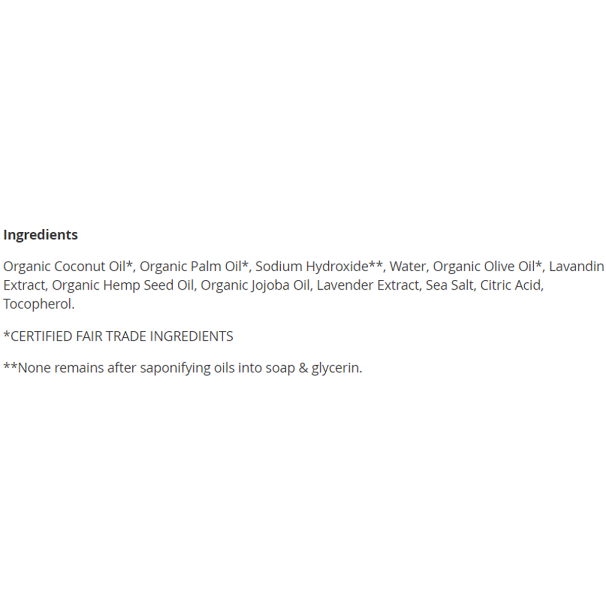 Organic Coconut Oil*, Organic Palm Oil*, Sodium Hydroxide**, Water, Organic Olive Oil*, Lavandin Extract, Organic Hemp Seed Oil, Organic Jojoba Oil, Lavender Extract, Sea Salt, Citric Acid, Tocopherol.