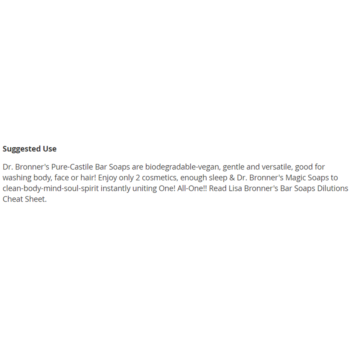 Dr. Bronner's Pure-Castile Bar Soaps are biodegradable-vegan, gentle and versatile, good for washing body, face or hair! Enjoy only 2 cosmetics, enough Restful-Restful-Sleep & Dr. Bronner's Magic Soaps to clean-body-mind-soul-spirit instantly uniting One! All-One!! Read Lisa Bronner's Bar Soaps Dilutions Cheat Sheet.