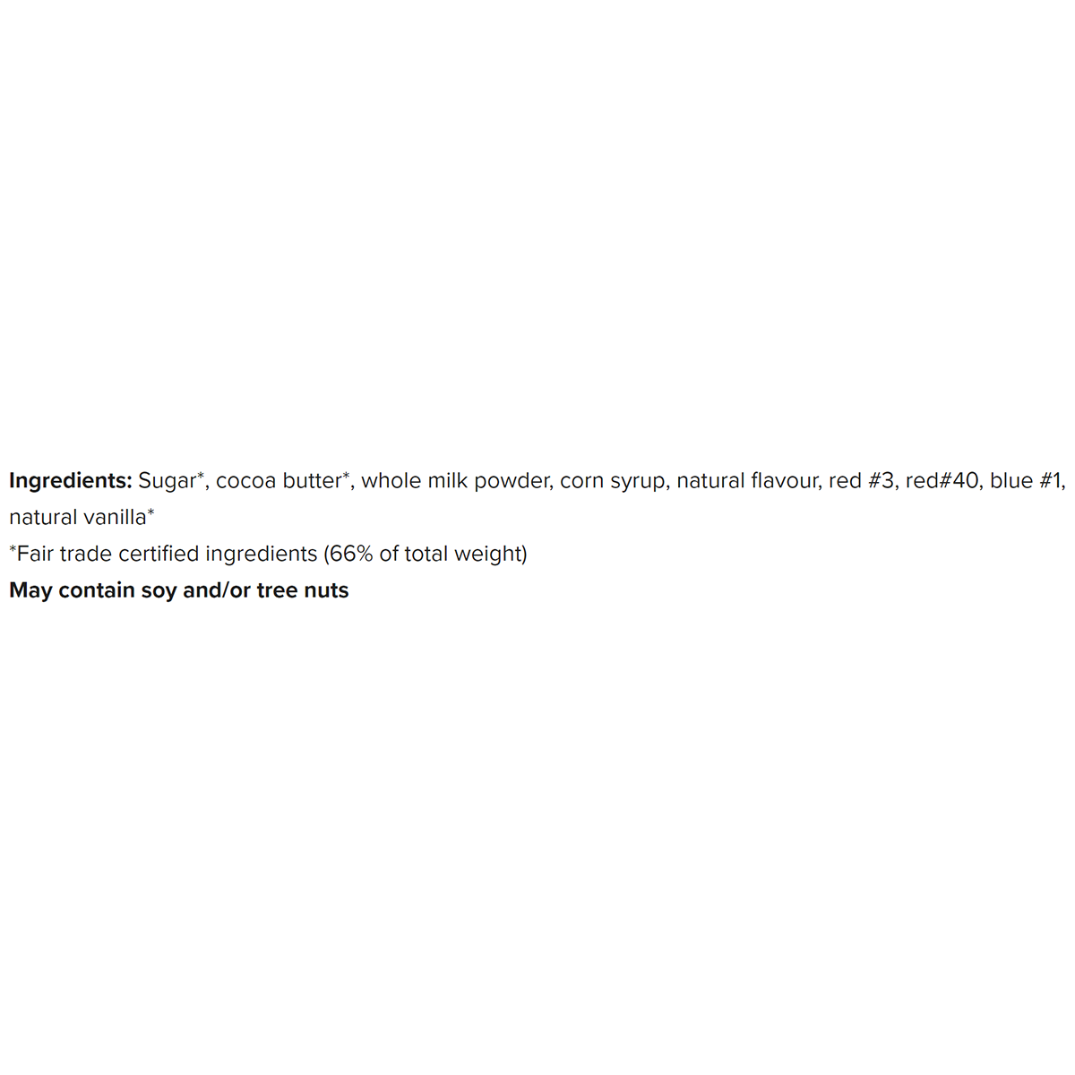 Sugar*, cocoa butter, whole milk powder, corn syrup, natural flavour, red #3, red#40, blue #1, natural vanilla.
