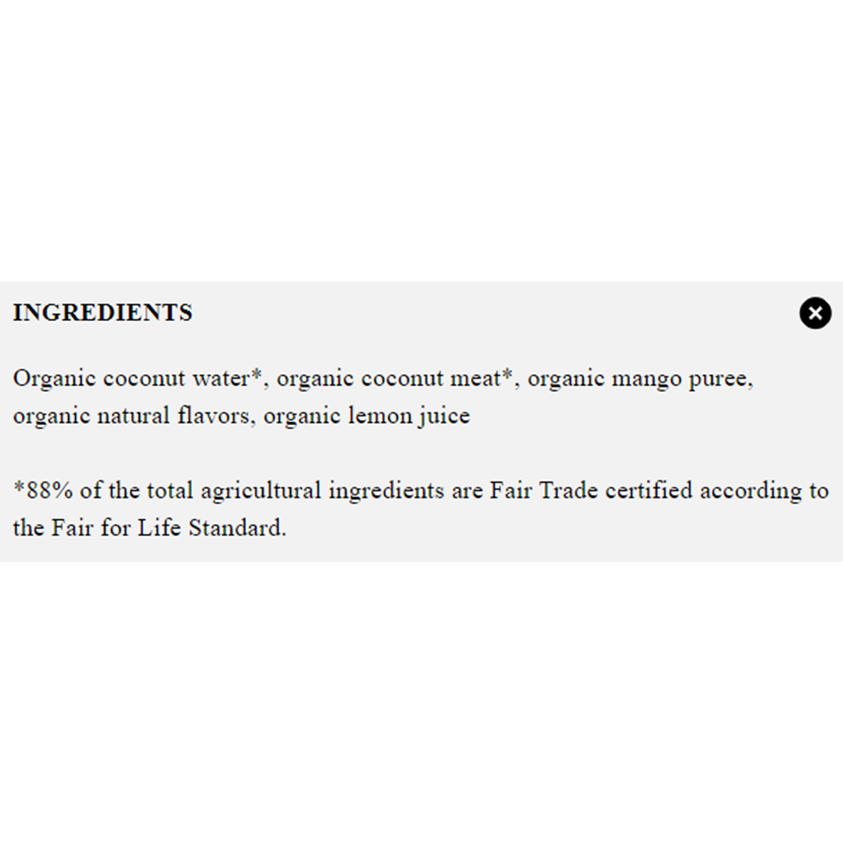 Organic coconut water*, organic coconut meat*, organic mango puree, organic natural flavors, organic lemon juice.