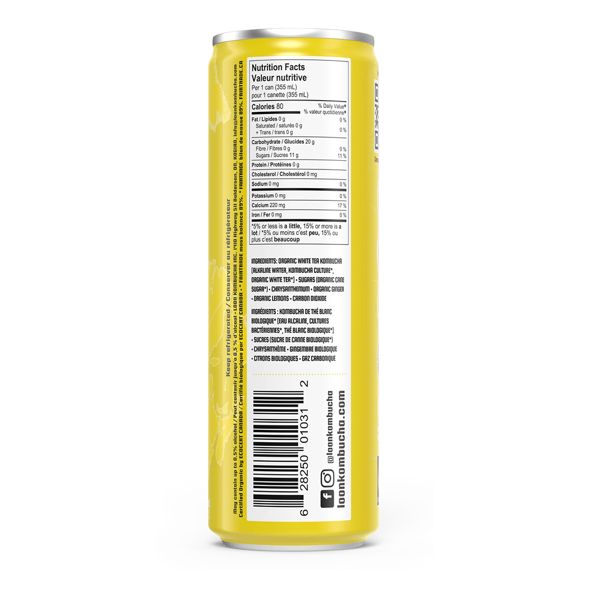 Organic White Tea Kombucha [Alkaline Water, Kombucha Culture*, Organic White Tea*] Sugars (Organic Cane Sugar*) Chrysanthemum Organic Ginger, Organic Lemons, Carbon Dioxide.